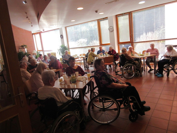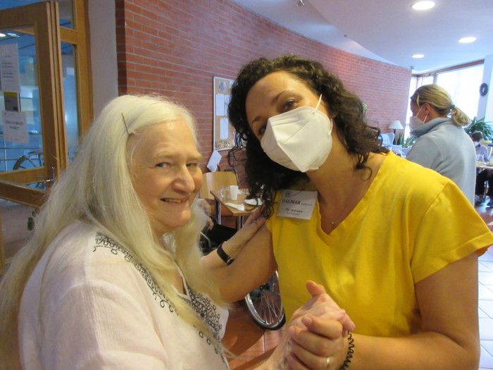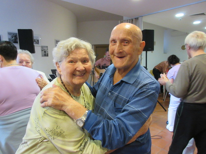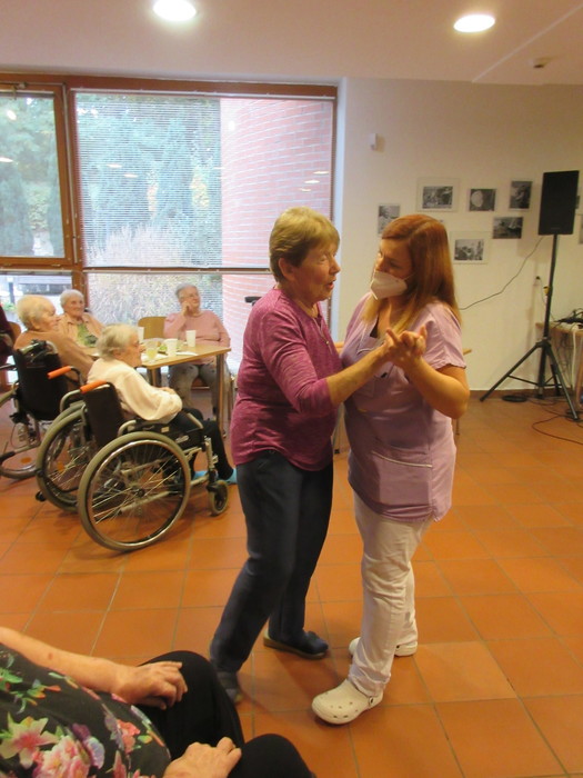 Imobilní uživatelka vyzvaná pracovnicí k tanci na vozíku.