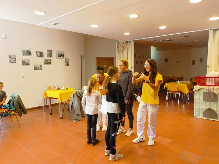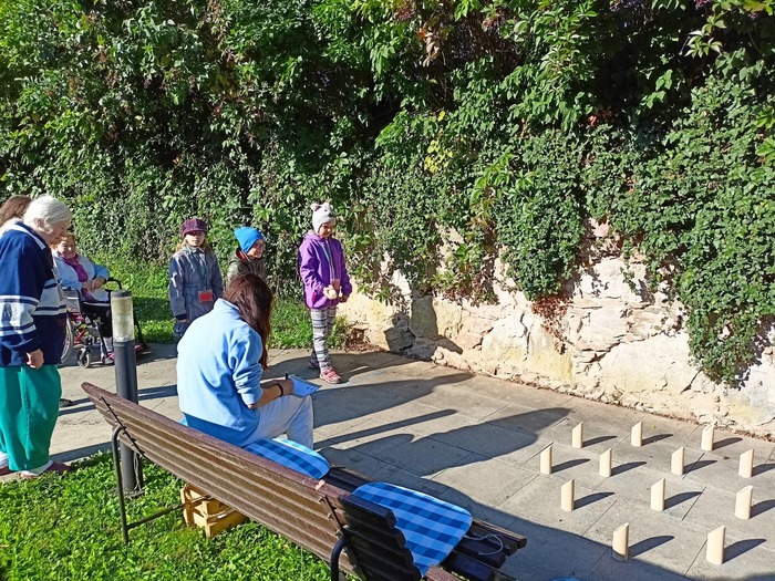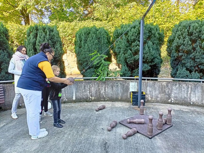 Děti a sociální pracovnice na stanovišti dřevěných kuželek.