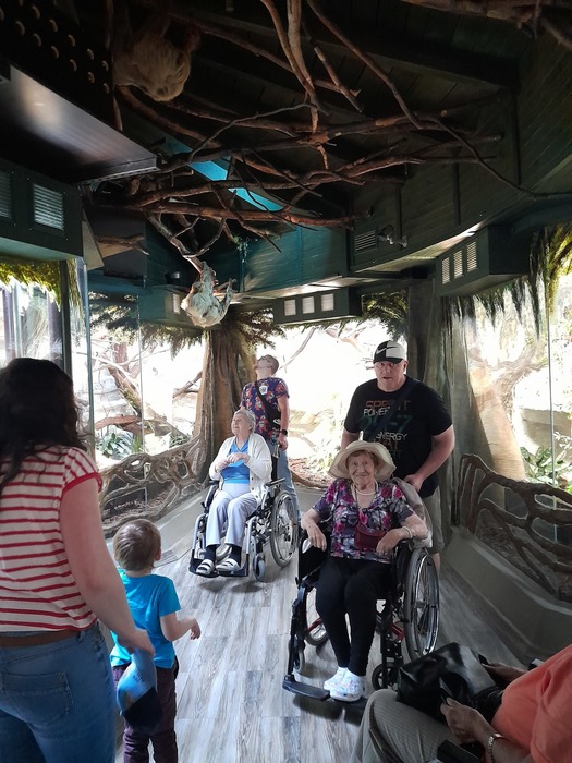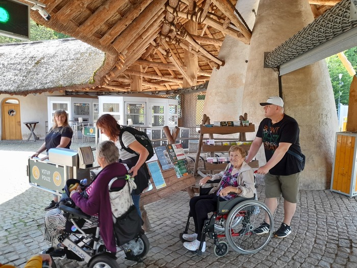 Zaměstnanci domova s uživateli při zastávce na kávě.
